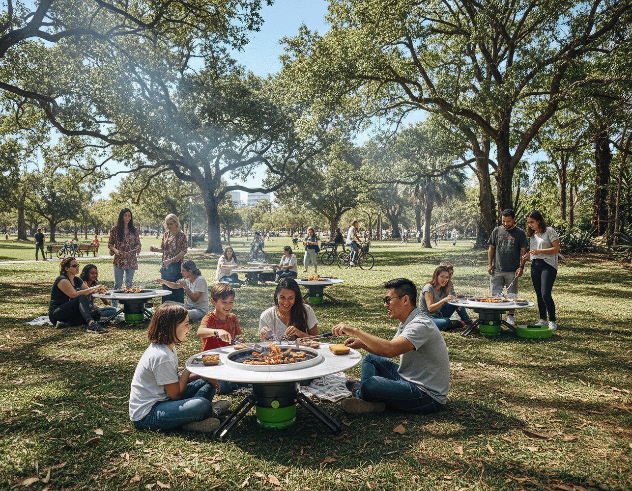 GRILLE in its use - in a nice spot in the park, surrounded by people enjoying putting their food on the BBQ and eating from a warm plate - offering the social eating experience similar to raclette.